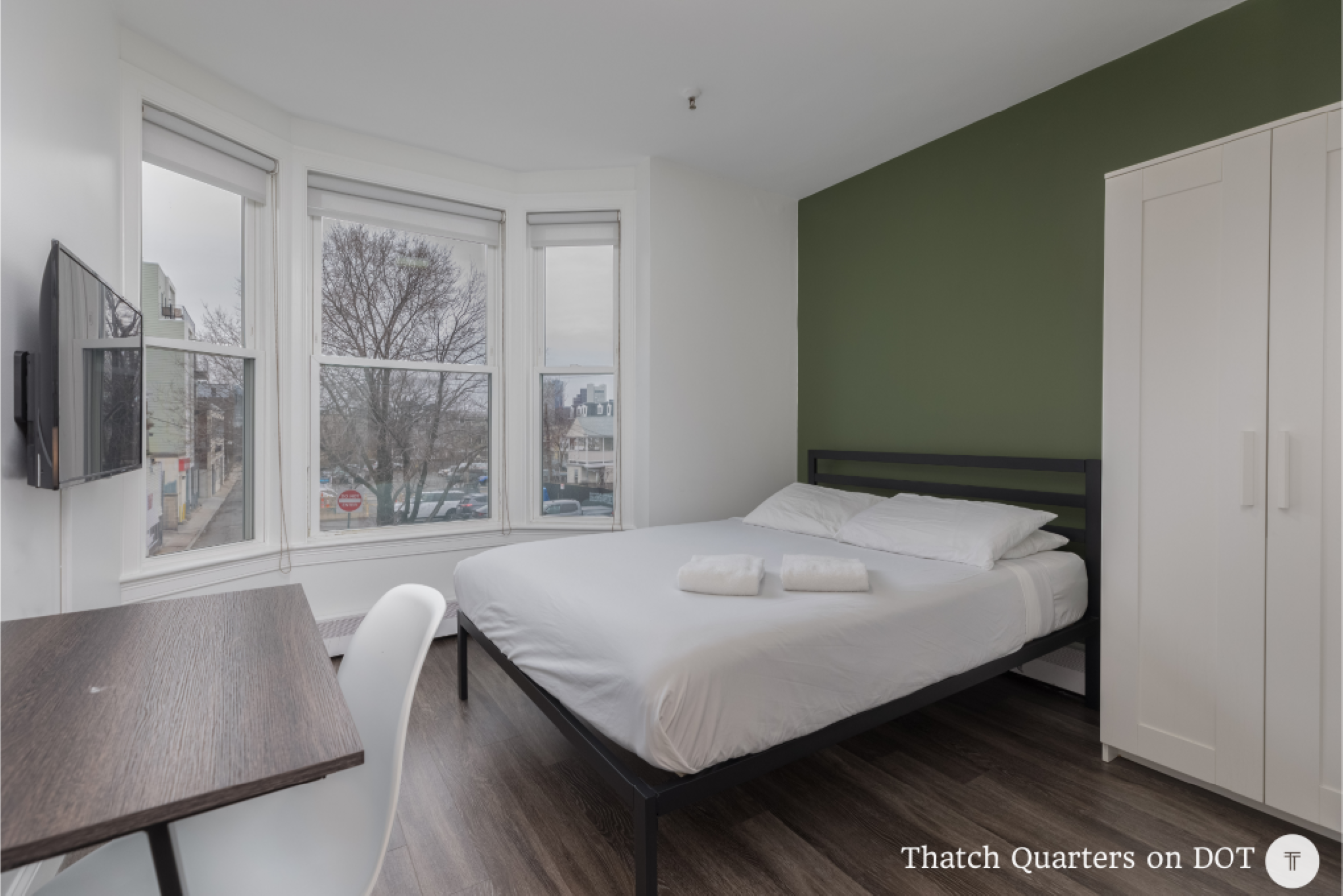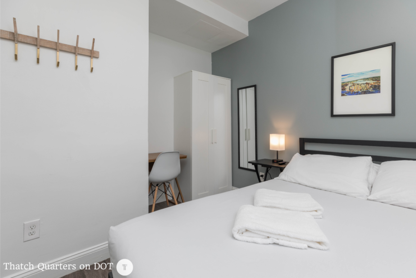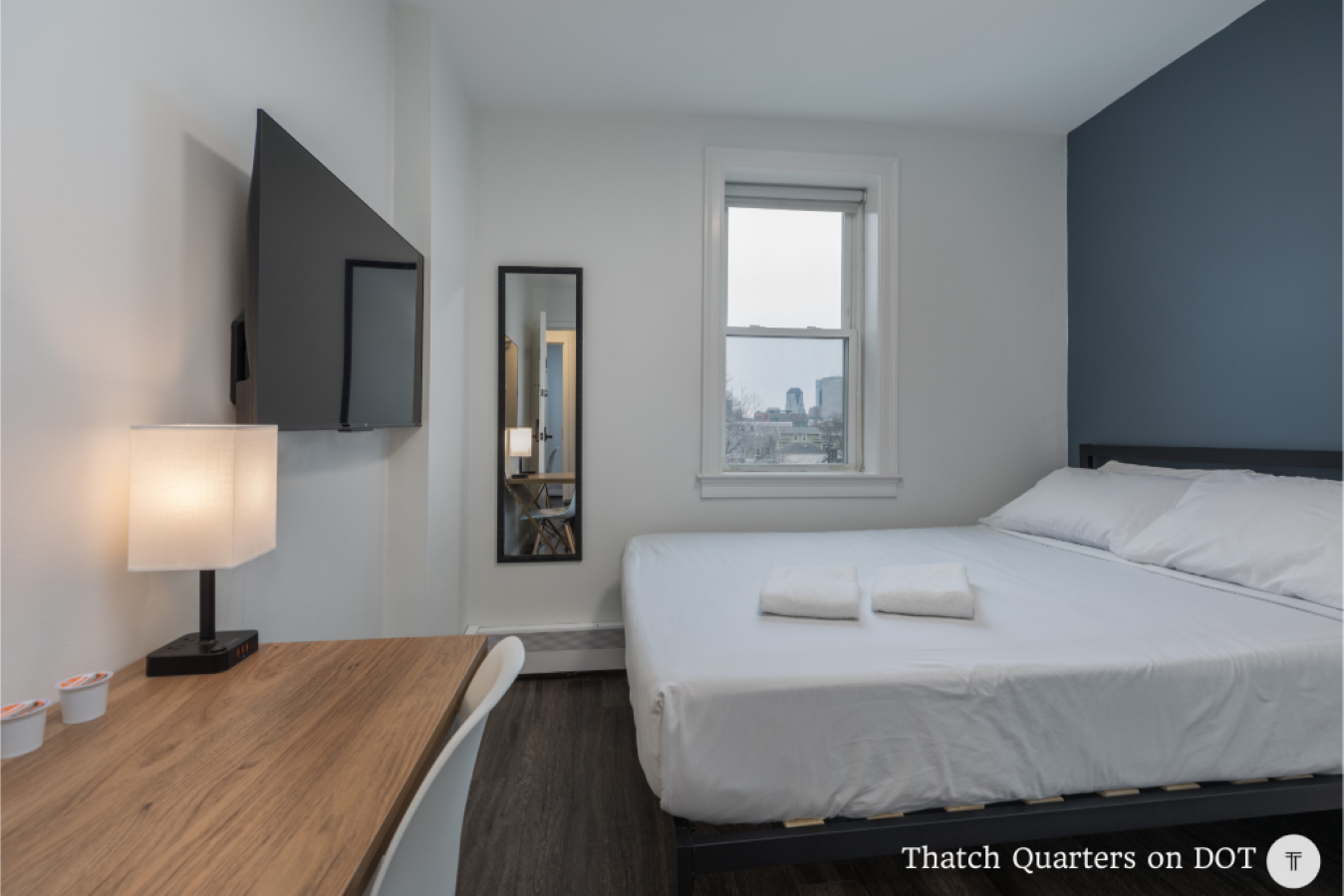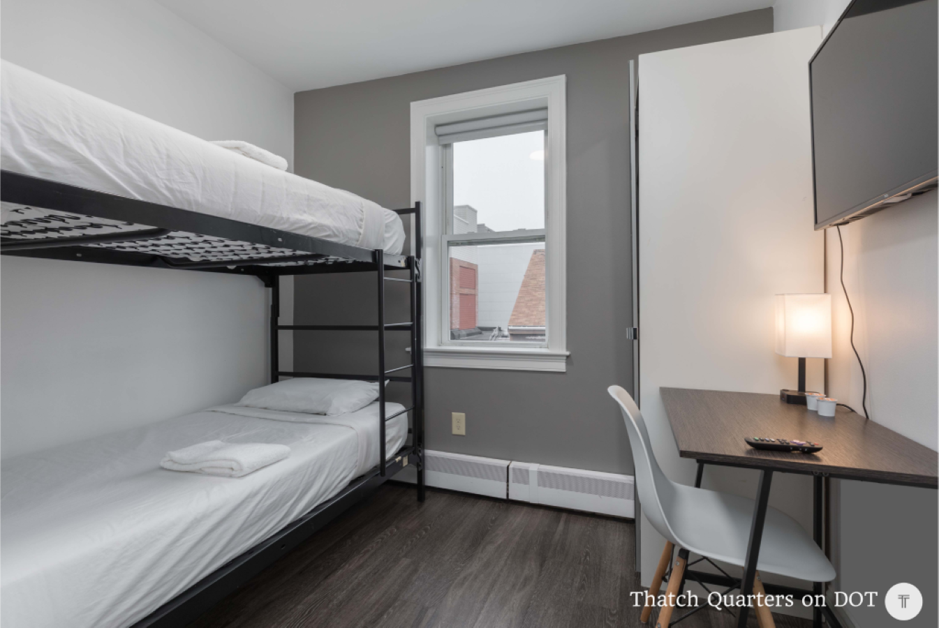 Thatch’s Quarters on DOT™ is our most budget-friendly hotel option in the city, offering basic amenities in a central location. A stay includes choice of a private queen room or twin bunk room with linens, towels for 2 and access to shared bathrooms. Located in the heart of South Boston, you will be steps from Southie’s best restaurants and bars, the “T” and a short walk to the Boston Convention and Exhibition Center (BCEC). Quarters™ is ideal for up to 2 travelers who are comfortable with sharing bathrooms and common spaces with other guests. The experience is like a hostel experience except you have a private bedroom and there are no services or on-site staff. If you are traveling on a tight budget or just need a place to drop bags and lay your head while in Boston, Quarters on DOT™ is a great option.